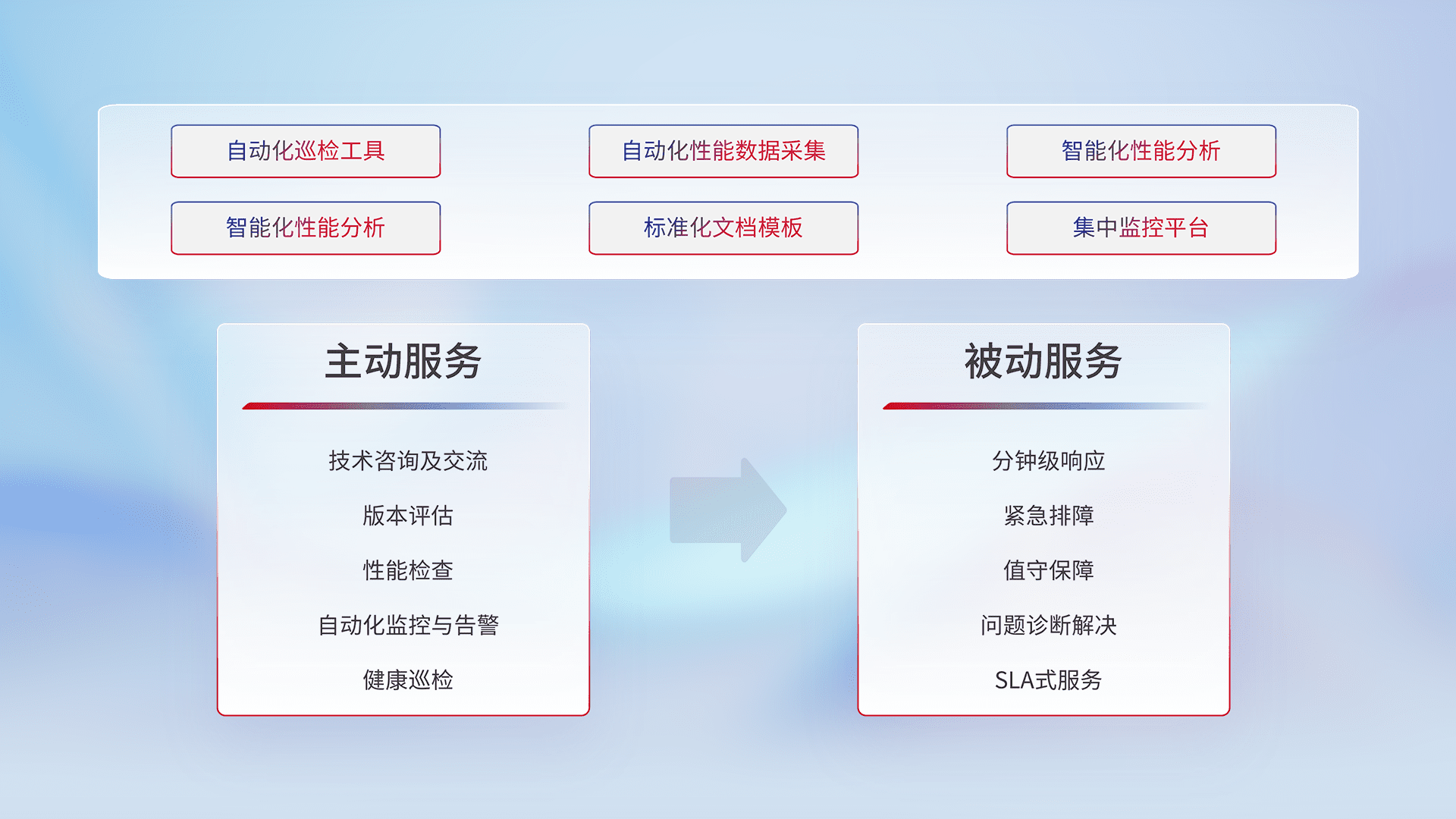 智能化工具和标准化文档,,保障服务质量,,提供主动服务(包含技术咨询、、、、版本评估、、性能检查、、、、自动化监控与告警、、、健康巡检)和被动服务包含(分钟级响应、、、紧急排障、、、、值守保障、、问题诊断解决、、、SLA服务)。。。