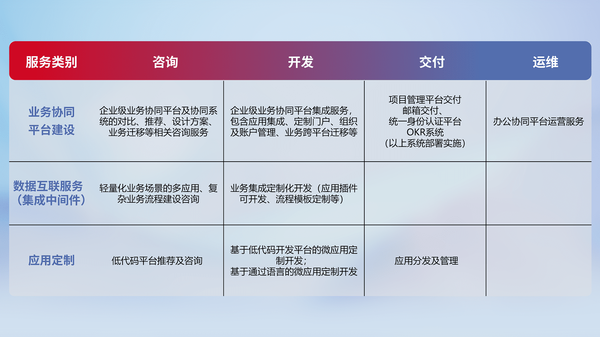 针对钉钉、、企微、、IDaas等平台级产品提供产品的规划、、方案、、、、交付、、、、定制化开发等服务,,实现如统一协同办公、、、智能客户服务、、混合会议管理、、、、智能数据查询、、、等业务场景,,实现数字化转型。。。